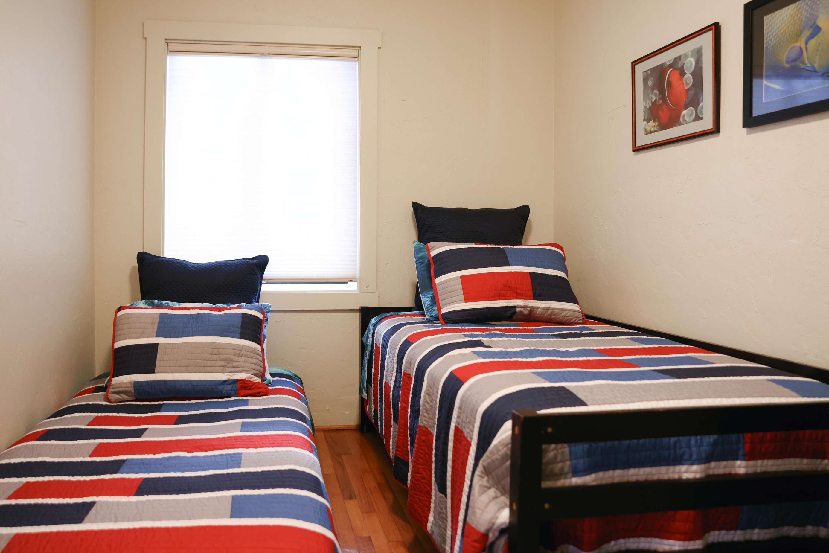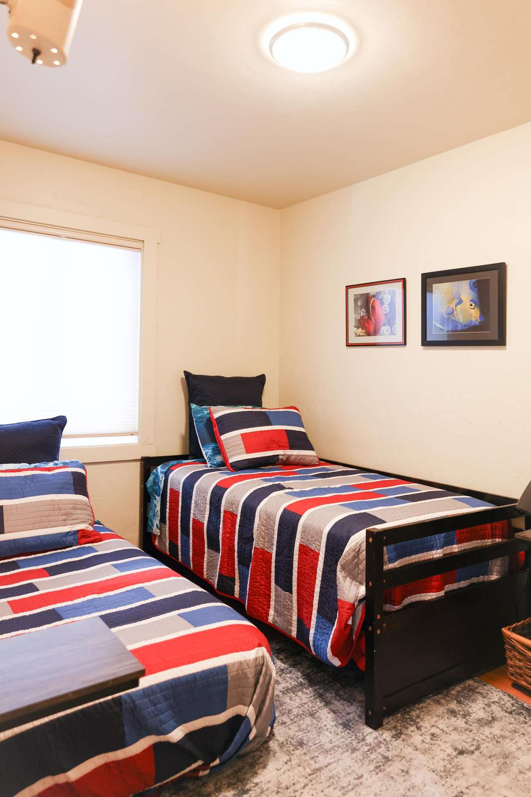 - The second bedroom has two twin beds.