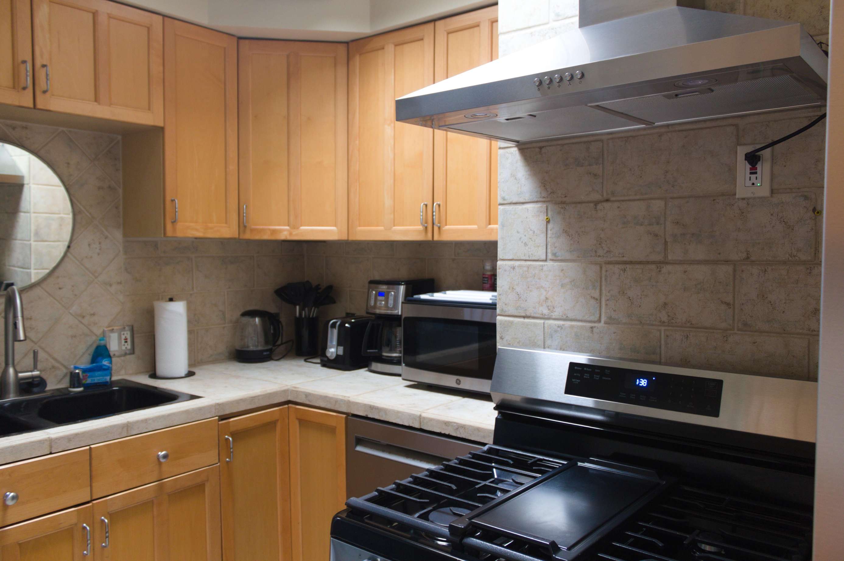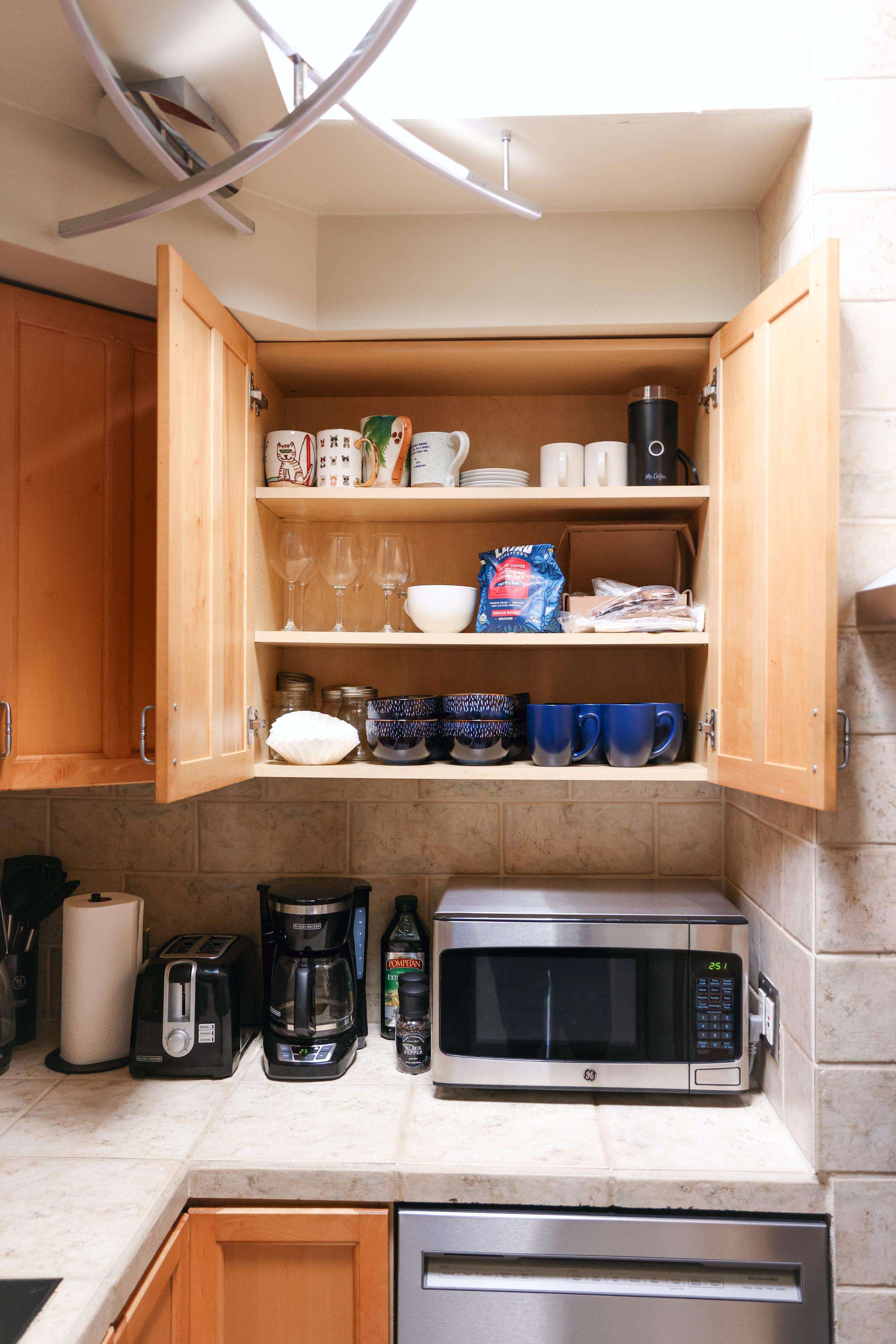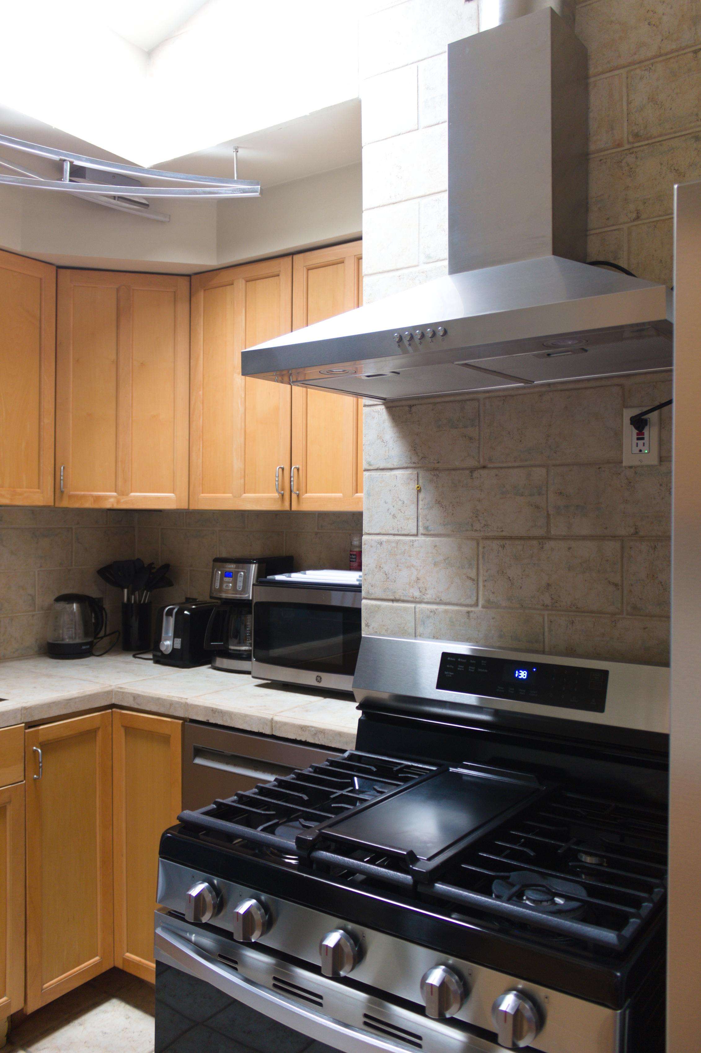 - Additional amenities such as a hot water kettle, coffee maker, wine glasses, toaster, baking sheet and blender for your culinary needs.