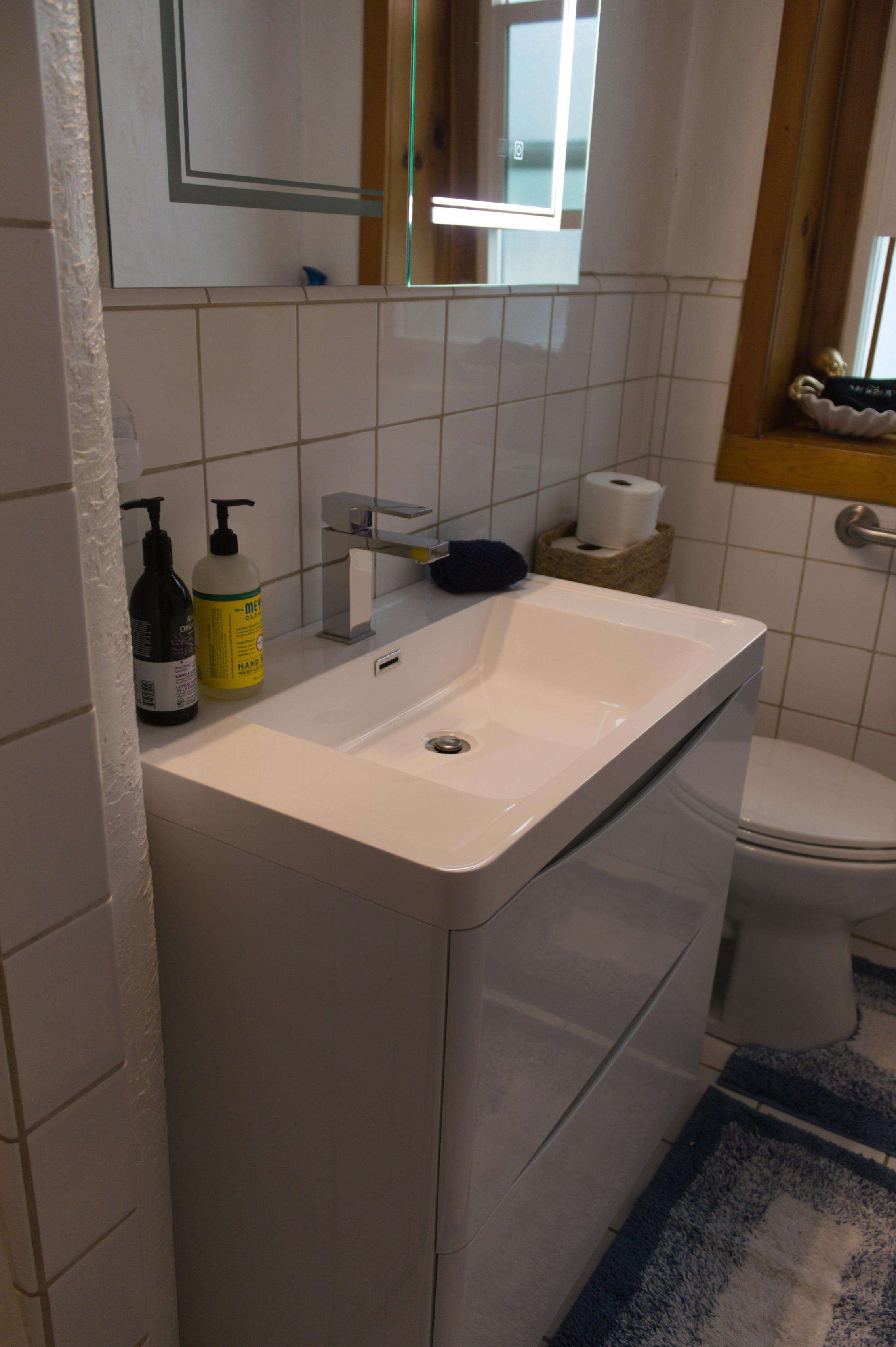 - Well-appointed 5'x9' bathroom with a shower, sink, and new toilet.