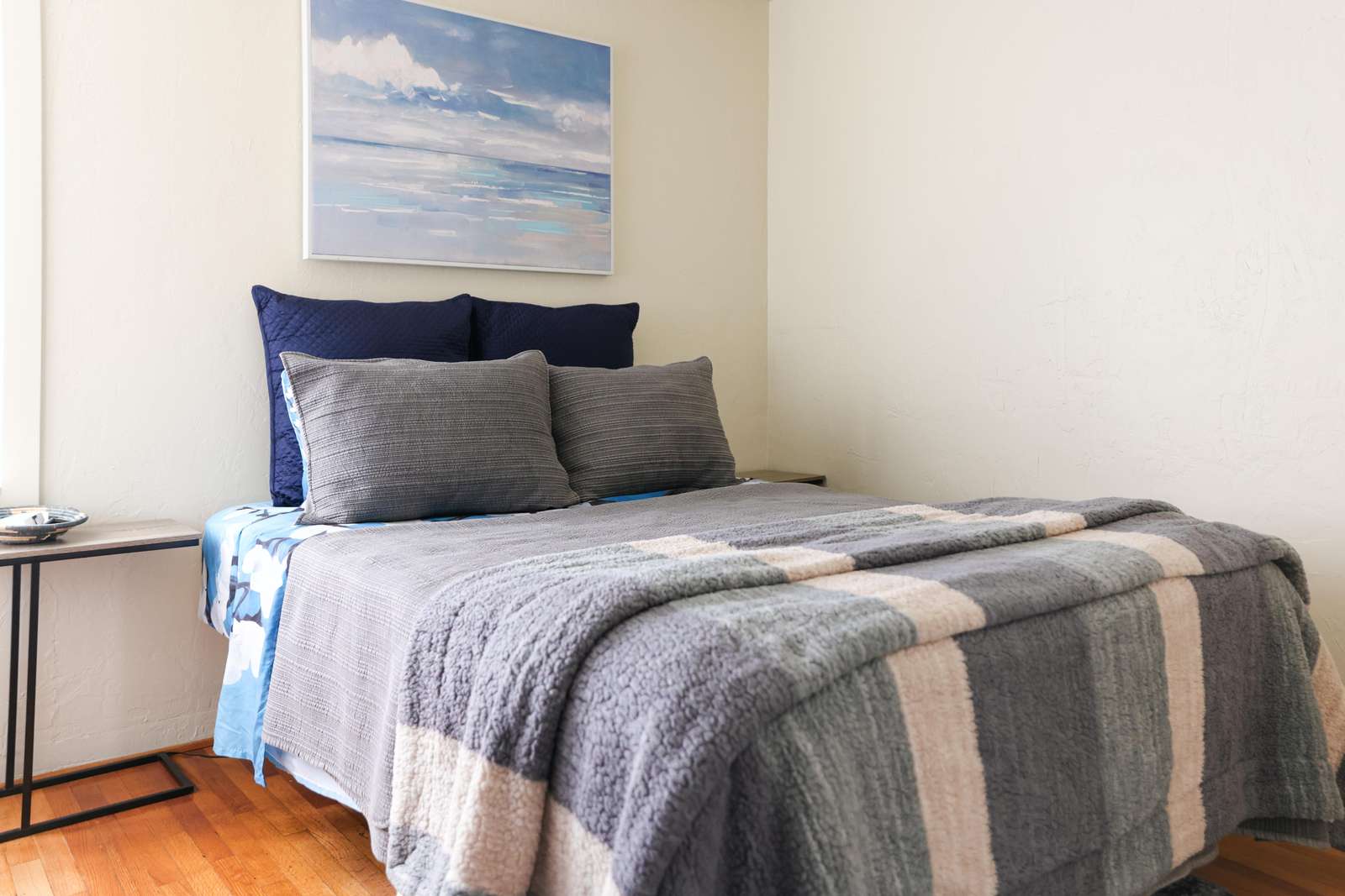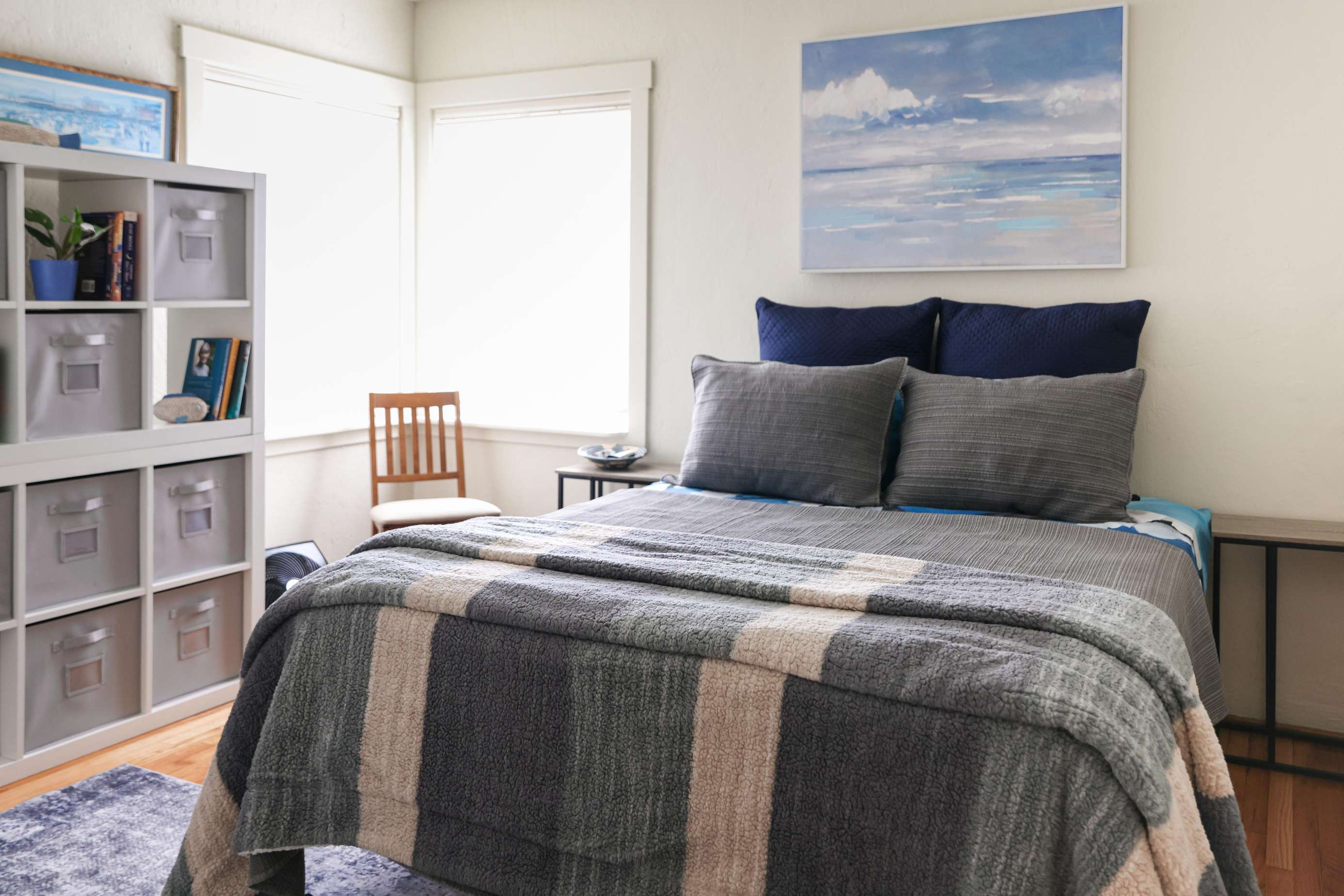 - The comfortable master bedroom has a queen size bed.